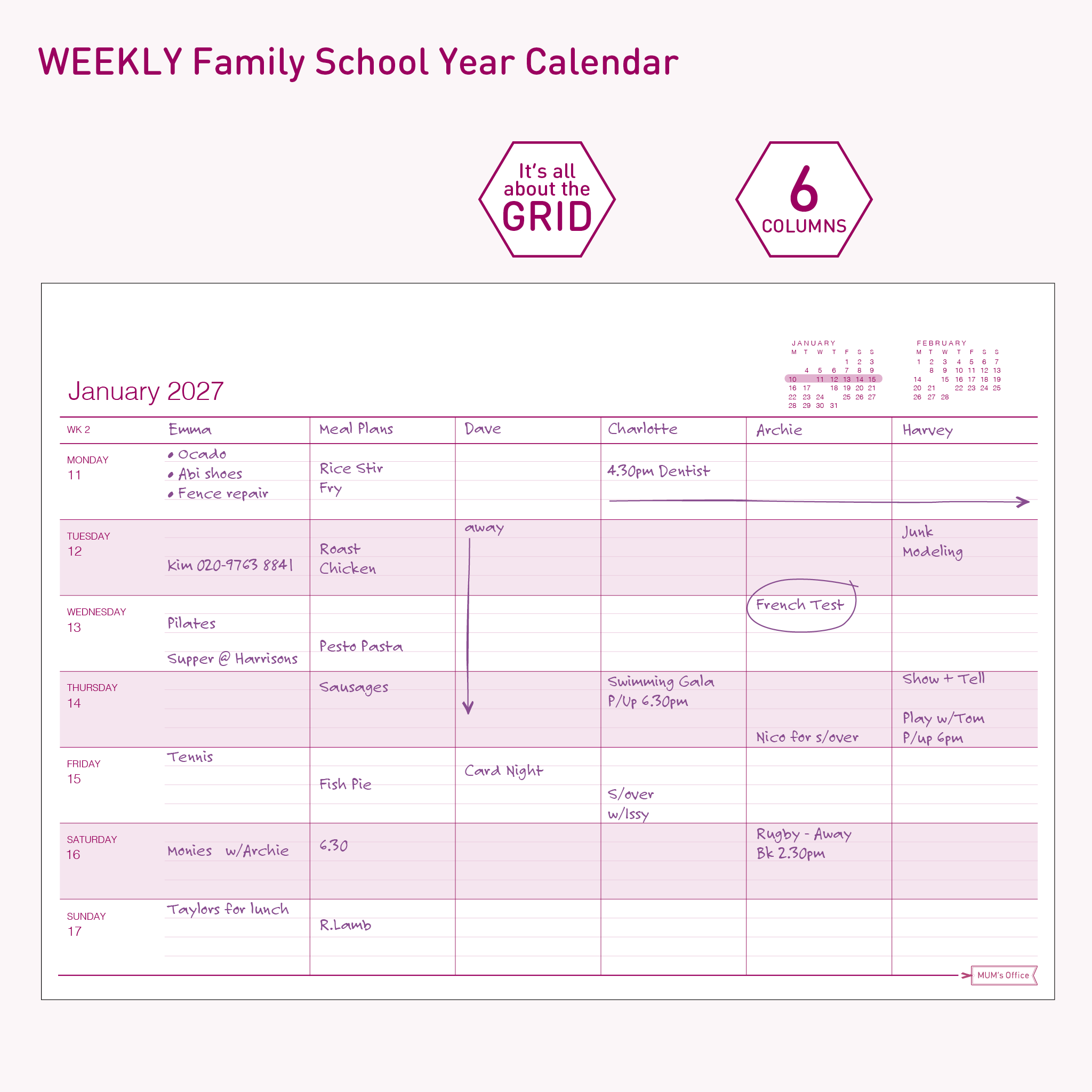 The Week-to-View GRID layout, with 6 columns means everyone's commitments are visible at a glance, cutting through the scheduling chaos of busy households.